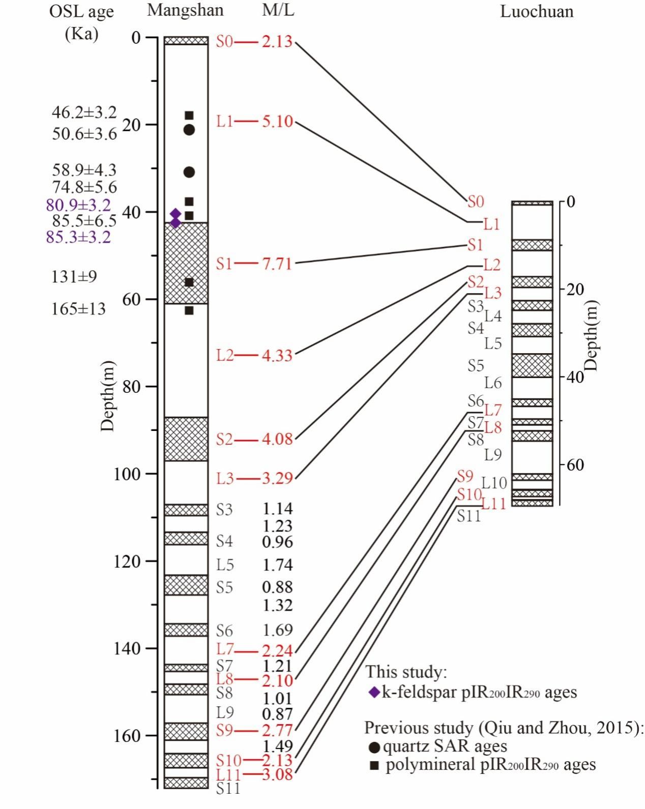 图2. 邙山黄土剖面与洛川黄土剖面的地层对比