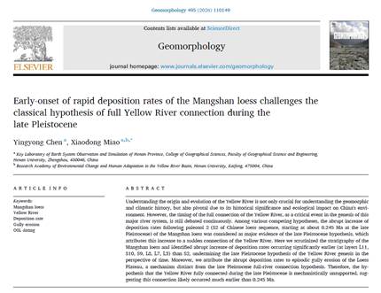 该研究以《Early-onset of rapid deposition rates of the Mangshan loess challenges the classical hypothesis of full Yellow River connection during the late Pleistocene》为题,发表在国际著名地学期刊Geomorphology上。河南大学地理科学与工程学部教师陈英勇为第一作者,苗晓东为通讯作者。该研究受到国家自然科学基金项目(42177425, 41701231)的资助。