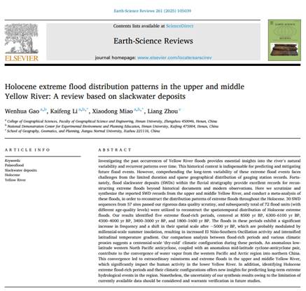 该研究成果以《Holocene extreme flood distribution patterns in the upper and middle Yellow River: A review based on slackwater deposits》为题,发表在国际地球科学顶级期刊Earth-Science Reviews (IF: 10)上。河南大学地理科学与工程学部教师高文华副教授为第一作者,李开封副教授和苗晓东教授为共同通讯作者。该研究受到国家自然科学基金项目(41701009, 41501214, 42177425)以及教育部人文社科基金(No.17YJCZH046; 23YJAZH064)以及河南省自然科学基金(222300420420)共同资助。