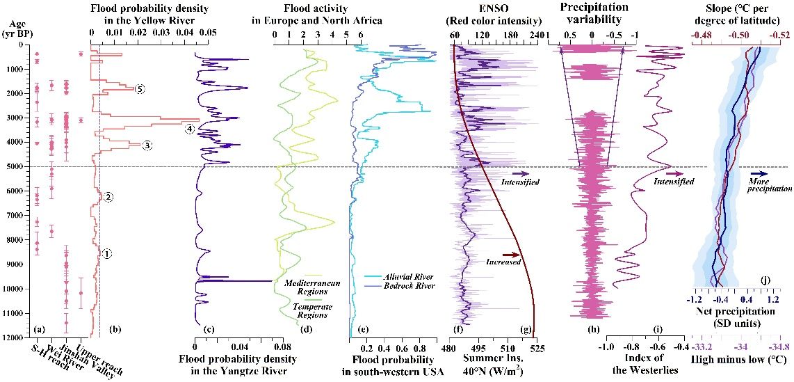 图2. 黄河中上游全新世极端洪水的空间分布(a)、时间序列(b)及与其他地区洪水记录和气候驱动因素对比