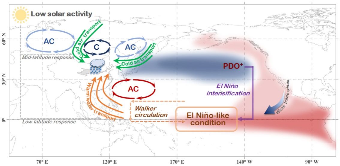 图3. 低太阳活动导致黄河中上游极端洪水的低纬度和中纬度响应示意图