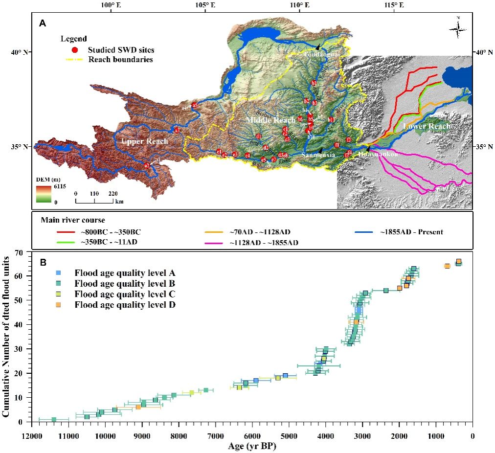 图1.(A)黄河中上游洪水滞流沉积点分布及下游河道历史变迁;(B)洪水滞流沉积的年代分布